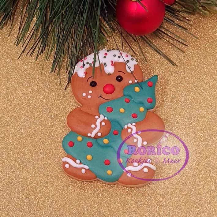 Schattig peperkoek mannetje met een kerstboom in de armen.